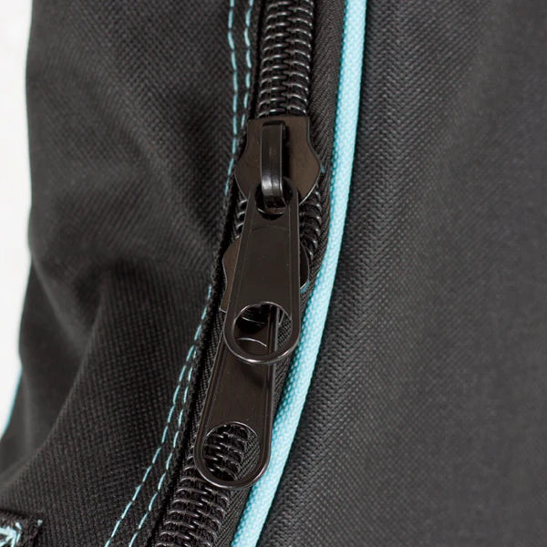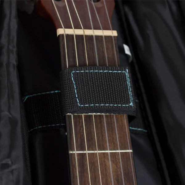 Fundas fabricadas en poliester negro con detalles en azul turquesa. Interior de poliéster negro. Acolchado polietileno 10mm. Mochilas, asa y bolsillo con capacidad para partituras. Medidas internas: 101x39x30x10cm.