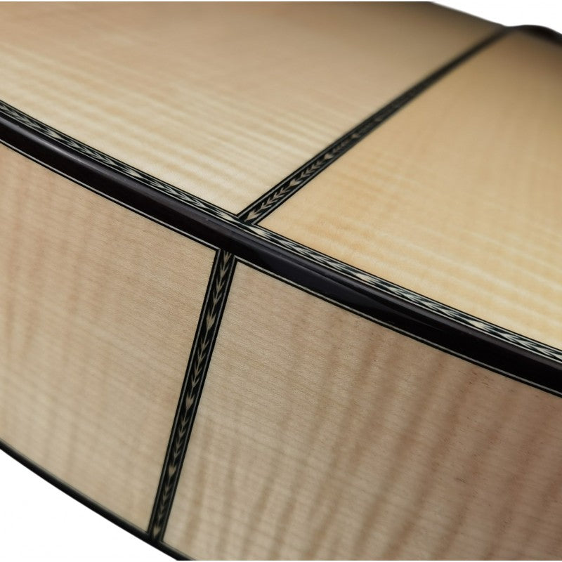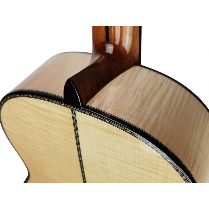 Para el cuerpo, en esta versión se emplea arce rizado, una madera poco habitual en guitarra clásica que aporta elegancia visual, gran estabilidad y un sonido brillante y definido.